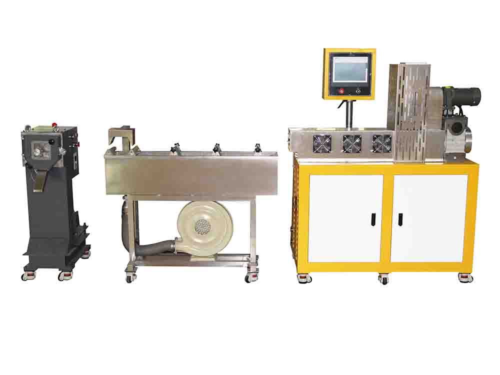 本機(jī)主要由主驅(qū)動(dòng)電機(jī)、傳動(dòng)裝置、擠出裝置、加料斗、電控系統(tǒng)、模頭等組成.其工作原理為:物流從料斗里放入經(jīng)過擠出裝置的塑化和擠出變?yōu)榱餮訝顟B(tài),再?gòu)闹鳈C(jī)經(jīng)模頭出來,擠出機(jī)組的用途不同其選配用的輔助設(shè)備也不盡相同。