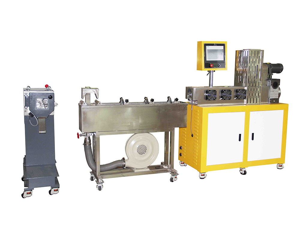 其工作原理為:物流從料斗里放入經(jīng)過擠出裝置的塑化和擠出變?yōu)榱餮訝顟B(tài),再從主機經(jīng)模頭出來,擠出機組的用途不同其選配用的輔助設(shè)備也不盡相同。